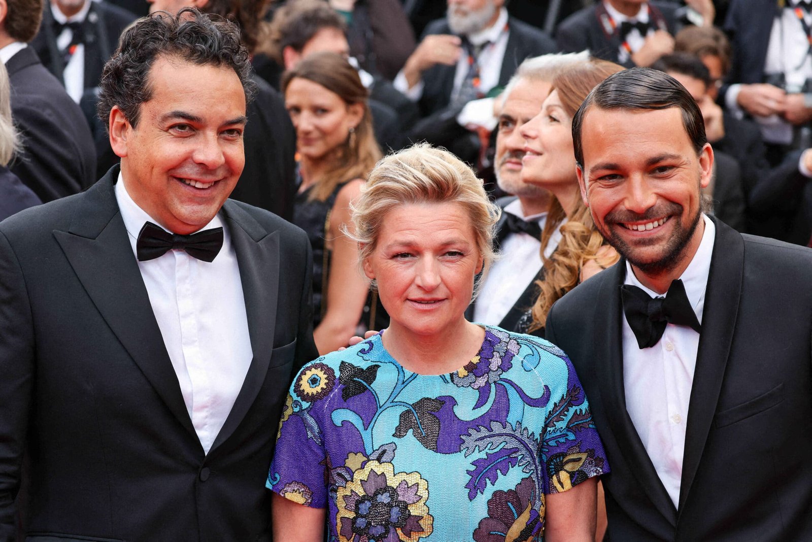 Le journaliste français Patrick Cohen, la journaliste française Anne-Elisabeth Lemoine et le journaliste français Bertrand Chameroy arrivent pour la projection du film "Killers of the Flower Moon" lors de la 76e édition du Festival de Cannes à Cannes, dans le sud de la France, le 20 mai 2023. Photo by Shootpix/ABACAPRESS.COM